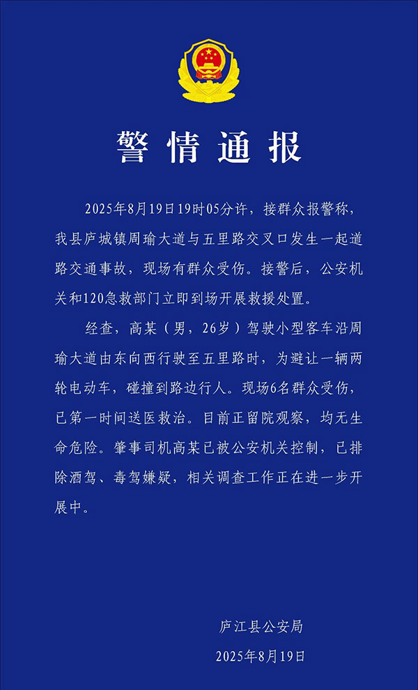 2025年8月19日19時05分許,接羣眾報警稱,我縣廬城鎮周瑜大道與五里路交叉口發生一起道路交通事故,現場有羣眾受傷。接警後,公安機關和120急救部門立即到場開展救援處置。