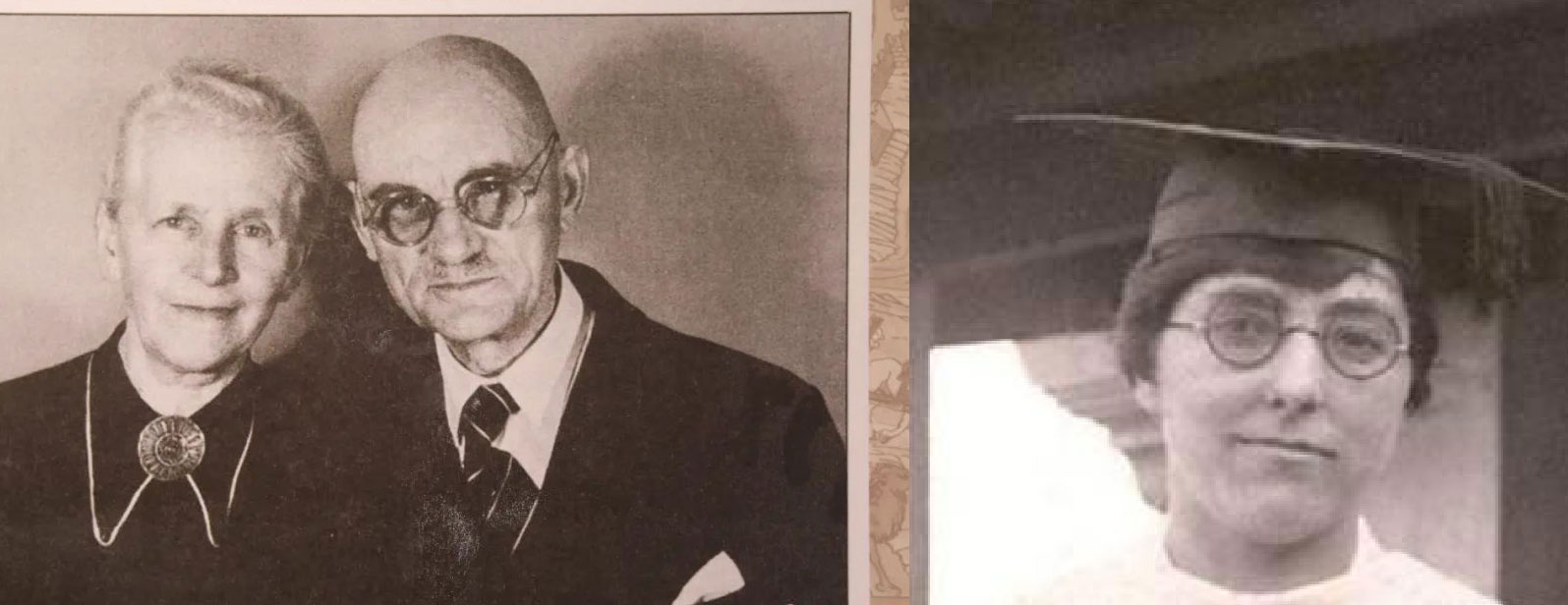 左為拉貝夫婦,拉貝是生於漢堡市的德國商人,以其在1937年末至1938年初的南京大屠殺期間的人道主義行為和作為南京大屠殺證據的《拉貝日記》而著名。右為明妮·魏特琳,1937年11月,她致信美國大使館,建議將金陵女子文理學院作為難民收容所,讓那些無法撤離南京的難民有一個相對安全的棲身之地。自12月13日到17日,她先後收納了8000多位難民。