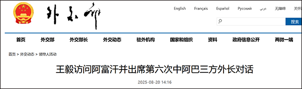 王毅訪問阿富汗並出席第六次中阿巴三方外長對話 guancha 2025-08-20 外交部網站消息,當地時間2025年8月20日上午,中共中央政治局委員、外交部長王毅抵達喀布爾,對阿富汗進行訪問並出席第六次中國—阿富汗—巴基斯坦三方外長對話。