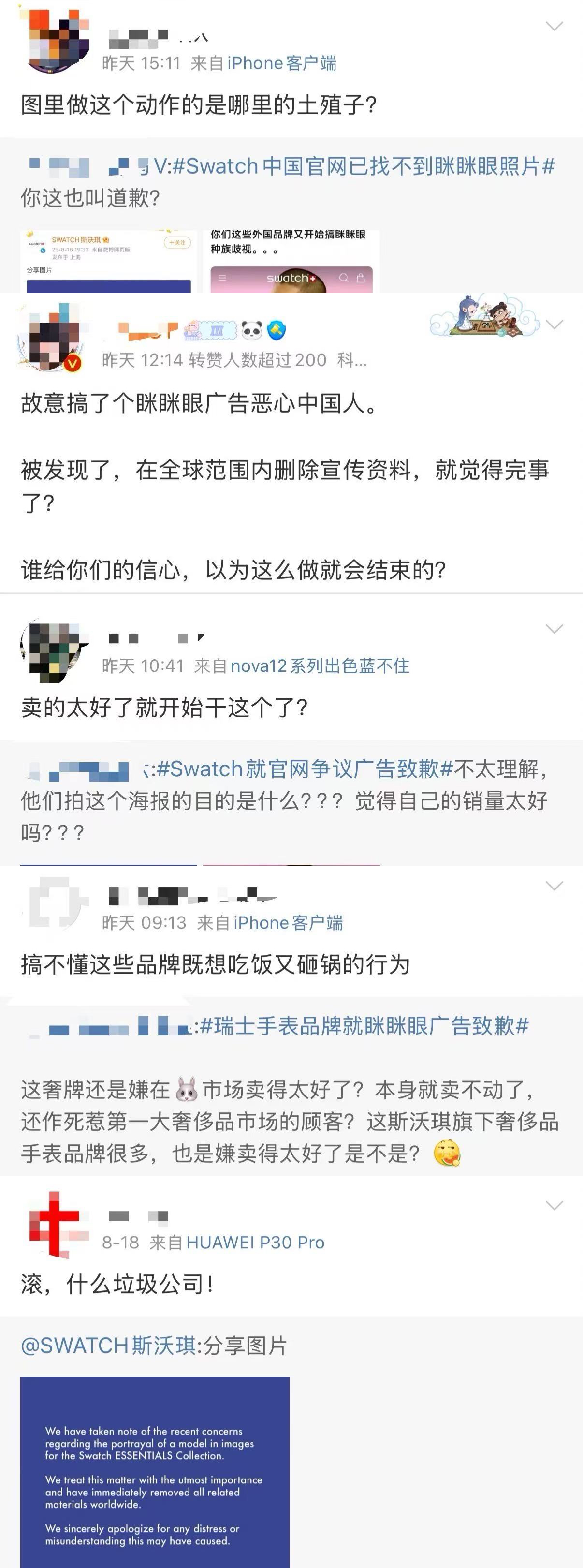 8 月 15 日,微博網友發現 Swatch Essentials 全球廣告中,亞裔男模手指拉眼角、眯眼咧嘴——這是國際公認的“slanty eyes”歧視符號。