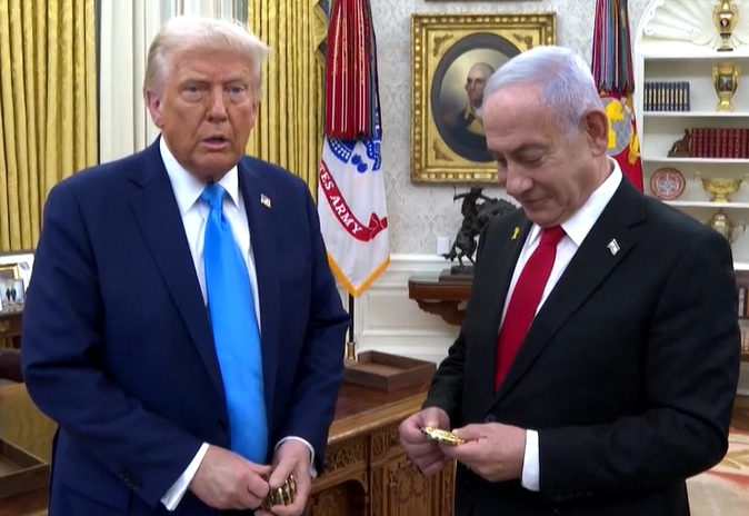 內塔尼亞胡2月訪問白宮期間,送給特朗普一台金色尋呼機 視頻截圖