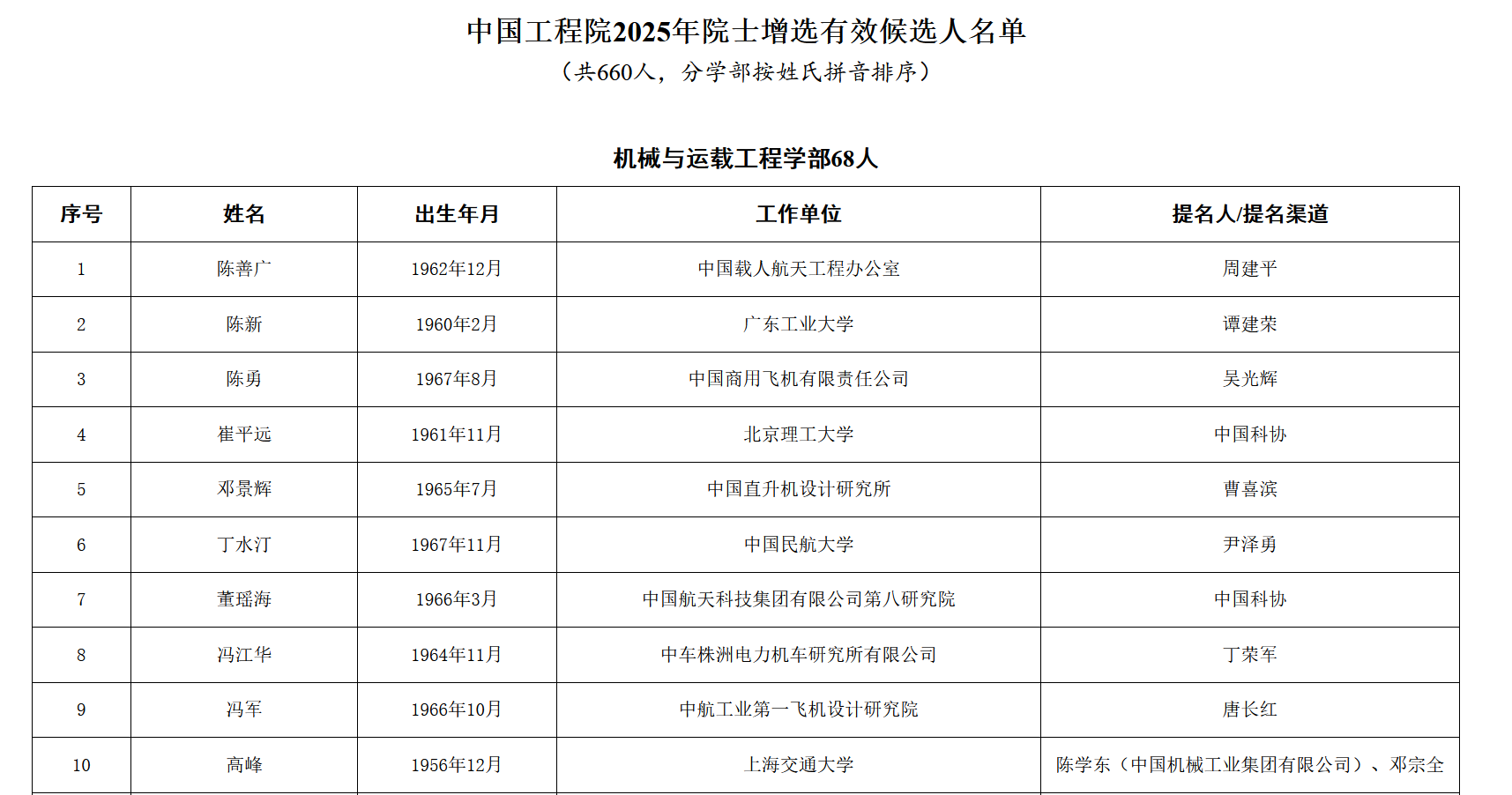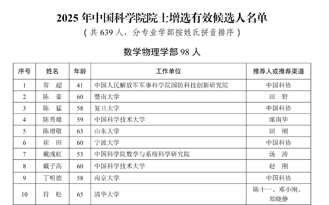 共1299人!2025年兩院院士增選有效候選人發佈 guancha 2025-08-20 今天(8月20日),中國科學院和中國工程院2025年院士增選有效候選人分別在中國科學院和中國工程院官網發佈。 其中:2025年中國科學院院士增選有效候選人639人。2025年中國工程院院士增選有效候選人660人。 2025年中國科學院院士增選有效候選人名單,部分如下,詳見鏈接。 2025年中國工程院院士增選有效候選人名單,部分如下,詳見鏈接。
