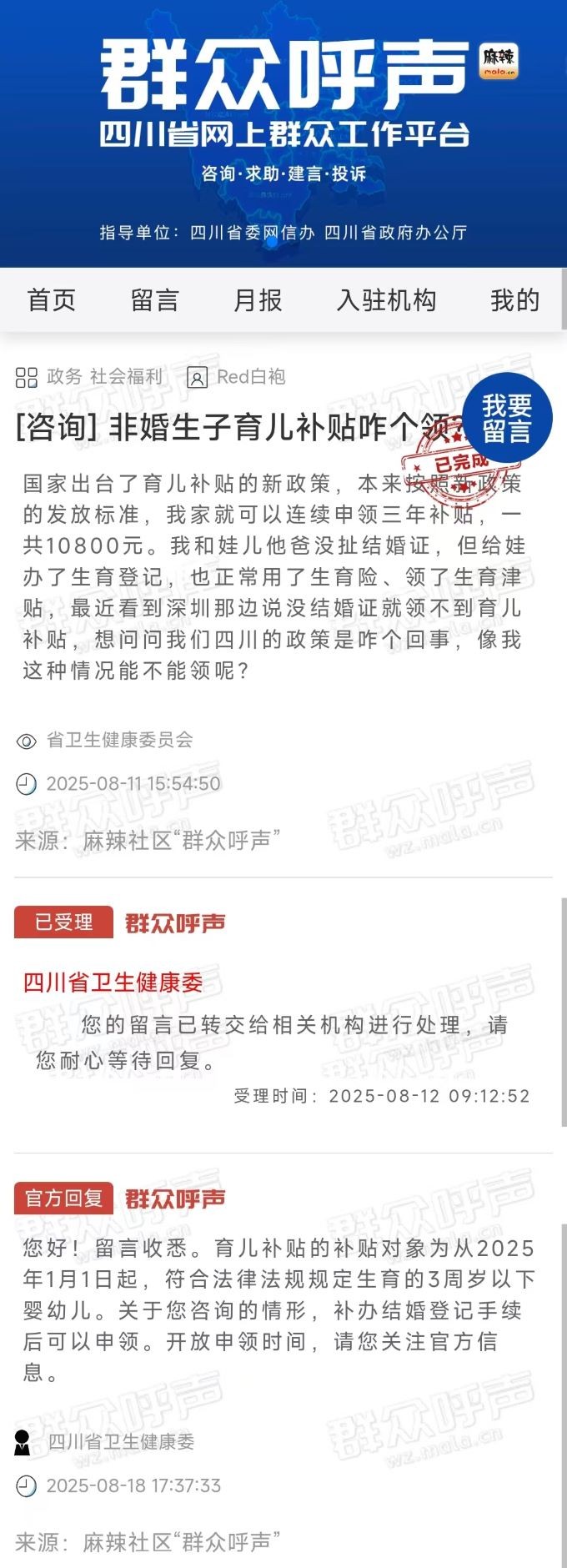 近日,有網民在麻辣社區“羣眾呼聲—四川省網上羣眾工作平台”留言諮詢,“我跟孩子他爸沒領結婚證,現在育兒補貼政策出來了,像我這種情況能領育兒補貼嗎?”