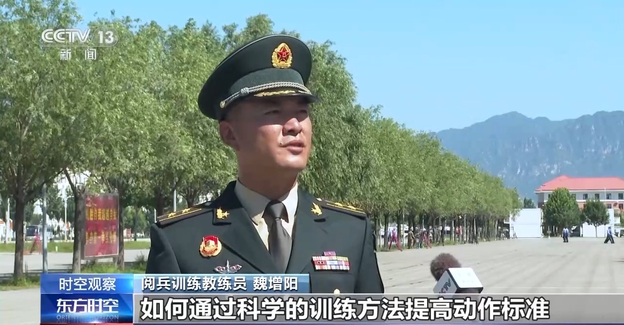 閲兵訓練教練員 魏增陽:每天這個時間段,我們一般會給大家安排一些體能消耗小的訓練內容。我和大家一塊學習如何通過科學的訓練方法提高動作標準。比如説有的隊員軍姿很好,但在齊步轉換正步的時候就有點不協調,這就需要適合的方法來解決。