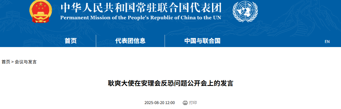 據中國常駐聯合國代表團網站消息,8月20日,中國常駐聯合國副代表耿爽在安理會反恐問題公開會上發言,呼籲國際社會在反恐問題上摒棄意識形態偏見和地緣政治考量。