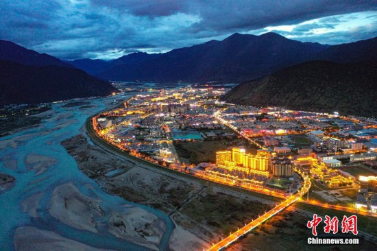2024年8月22日晚,西藏林芝市城市夜景。(無人機照片)中新社記者 貢嘎來松 攝