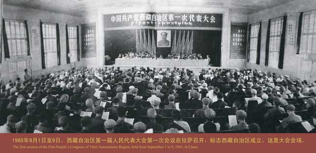 1965年9月,西藏自治區第一屆人民代表大會第一次會議在拉薩召開,西藏自治區及其人民政府宣告成立,西藏各族人民與全國人民一道走上了社會主義的康莊大道。