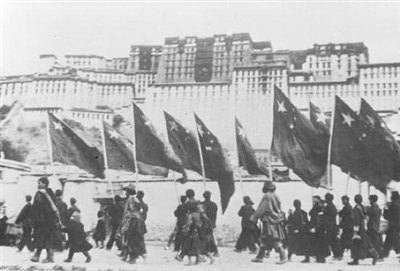 1951年10月26日,西藏地方政府為人民解放軍舉行隆重的入城式, 進駐拉薩的官兵手持國旗從布達拉宮前通過。圖源:團結網