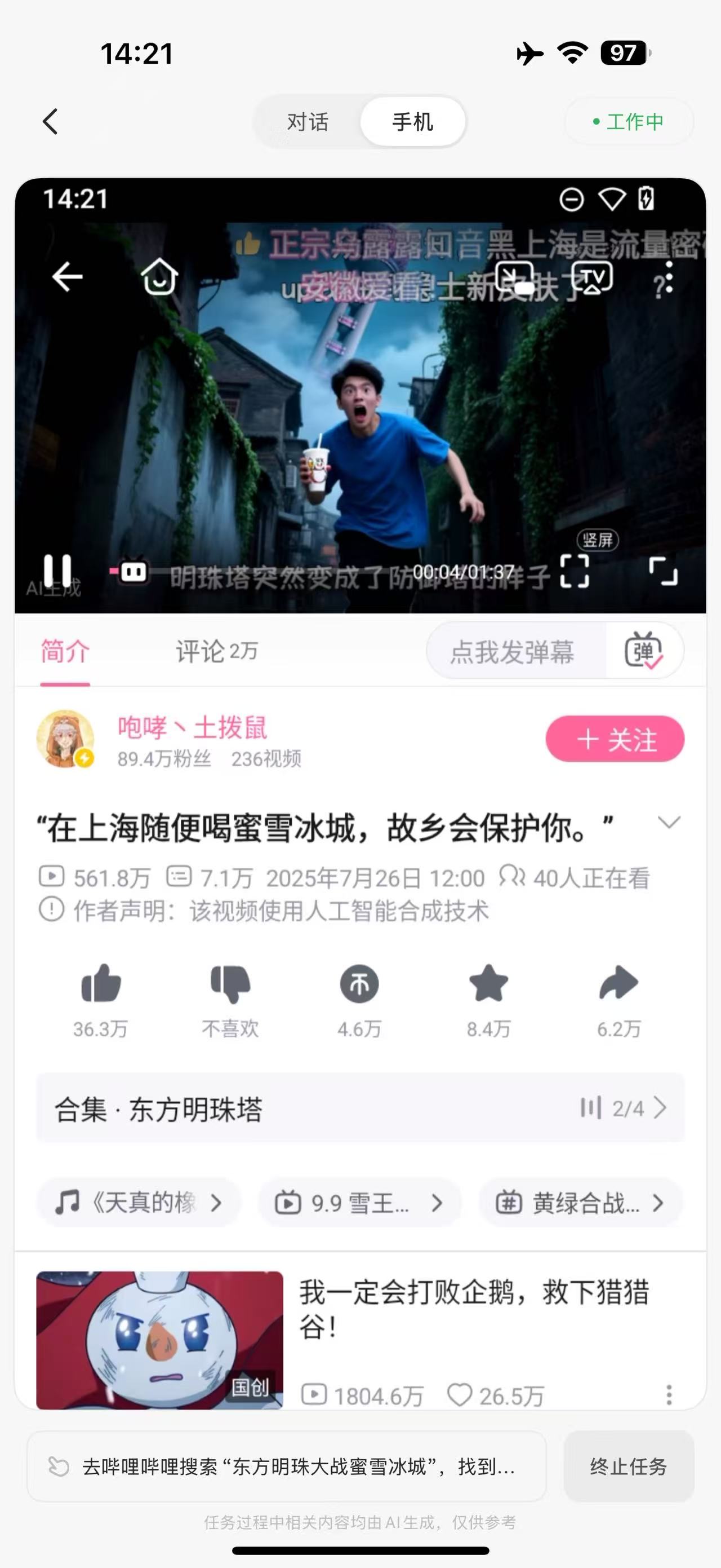 值得注意的是,AutoGLM並沒有在搜索結果中選擇標題中明確帶有東方明珠和蜜雪冰城字樣的內容,而是似乎理解了這個主題,選擇了播放量最高的相關內容。