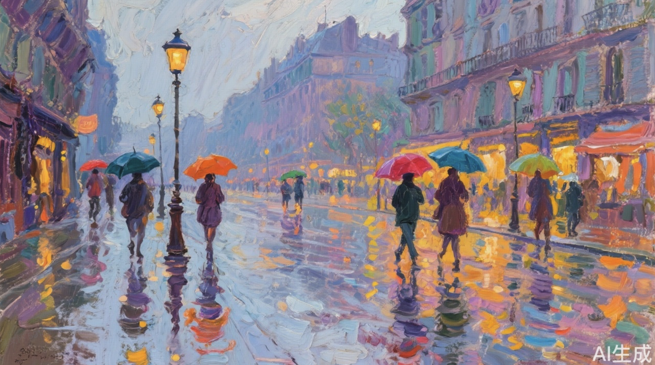 AI生成莫奈風格雨中路人圖