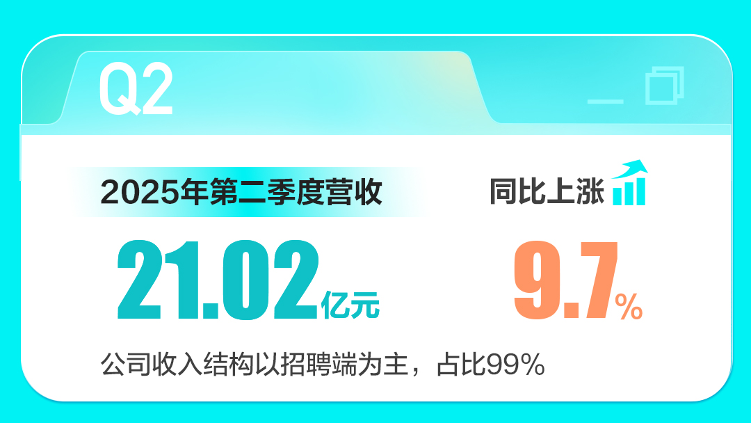 2025年第二季度,公司實現營收21.02億元。長期以來,公司收入結構以招聘端為主,佔比達到99%。2025年第二季度,來自招聘端的收入為20.78億元。