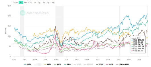 而且不可否認的是,在主要大國中,中國的資產證券化率也是相對偏低的。根據MarcoMicro網站統計,截至2025年8月,中國的股票總市值與GDP比值不僅低於美國的201.99%、日本的180.24%,甚至低於印度的124.46%和德國的64.72%,為幾個大國中最低水平為62.51%。