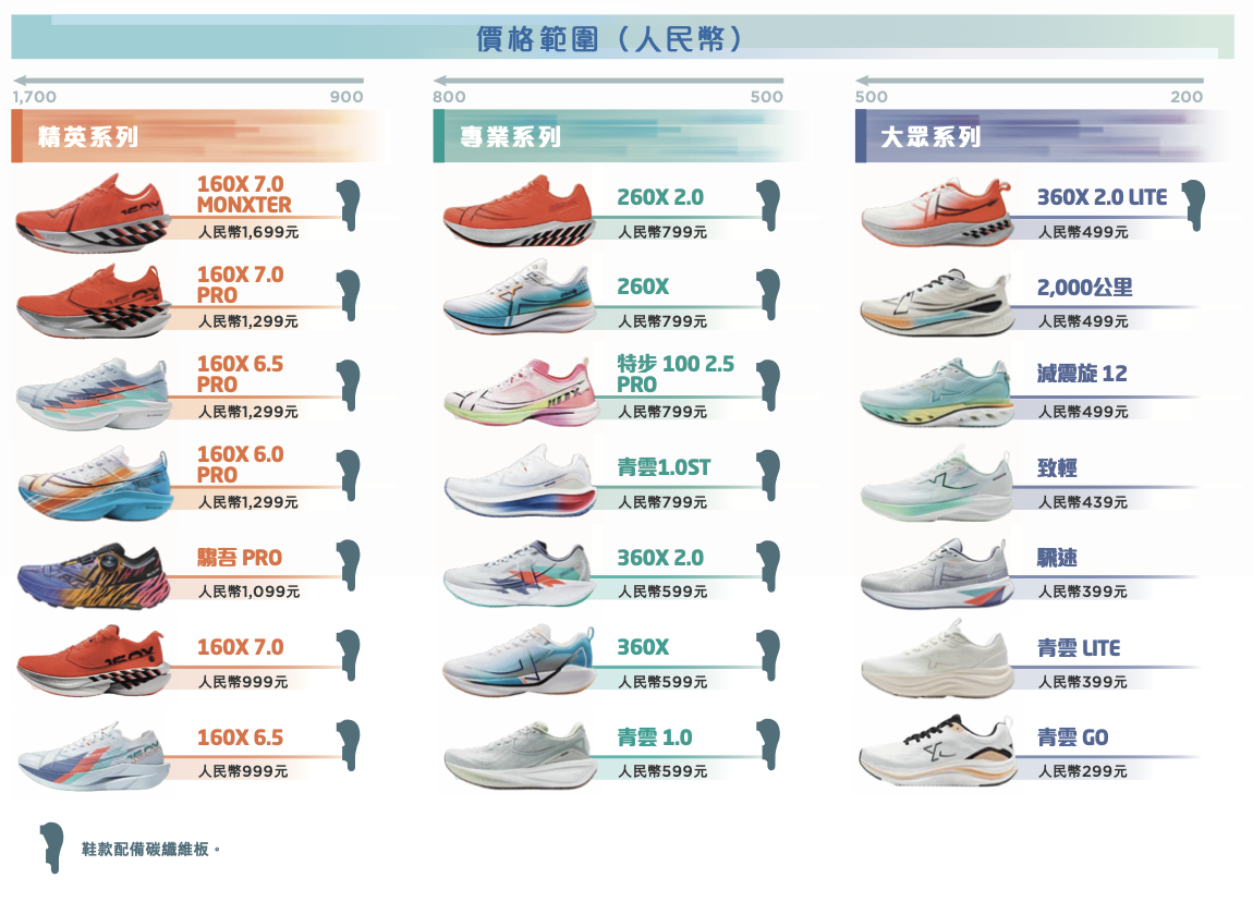 同期,特步主品牌營收為60.53億元,同比增長了4.5%。據2025年中期報道,特步品牌的產品也做到了全面覆蓋各種類型的跑者,分為大眾系列、專業系列和精英系列三部分,價格帶低至299元,高到1600元。