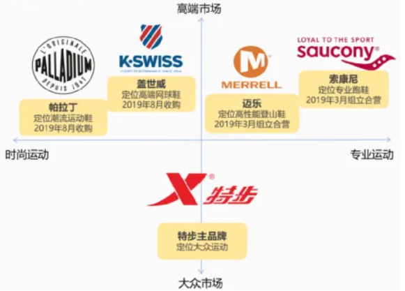 特步搭建高端市場中時尚運動和專業運動兩個方向,以及主品牌面向大眾市場的戰略佈局,被稱為“1+4”的品牌矩陣。