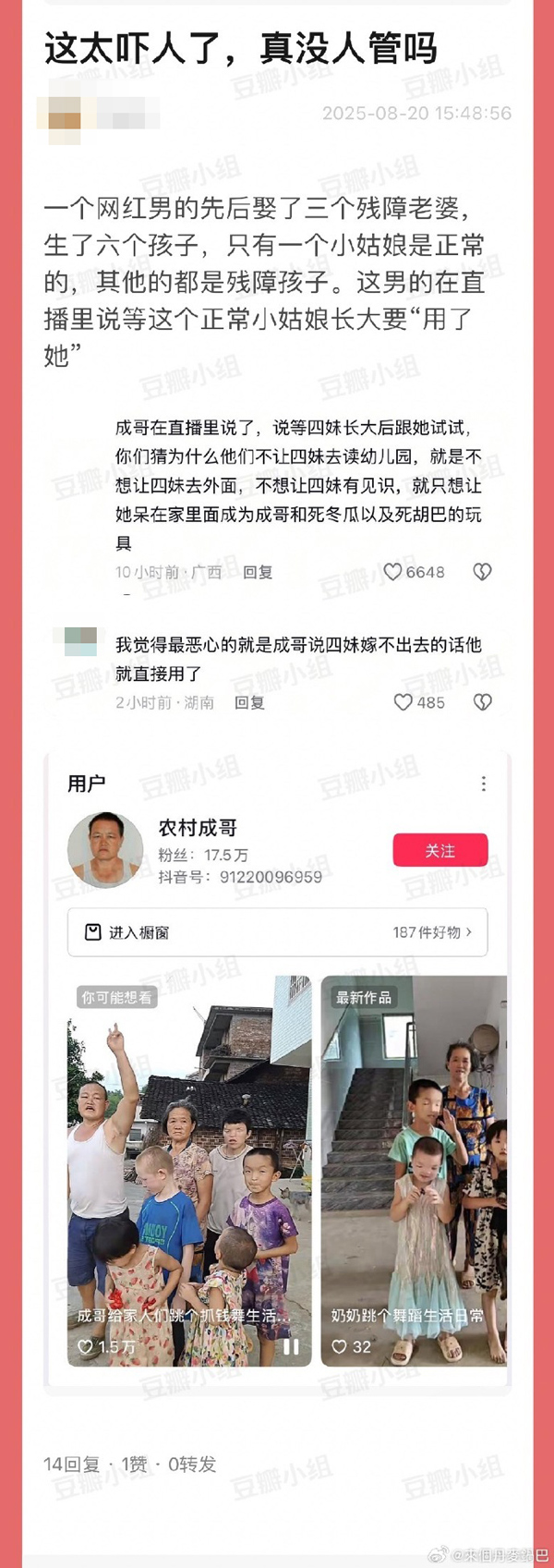 此前,有網友發帖稱, 賬號“農村成哥”先後娶了三個殘障老婆,生了六個孩子,只有一個小姑娘是正常的 ,其他都是殘障孩子,引發熱議。