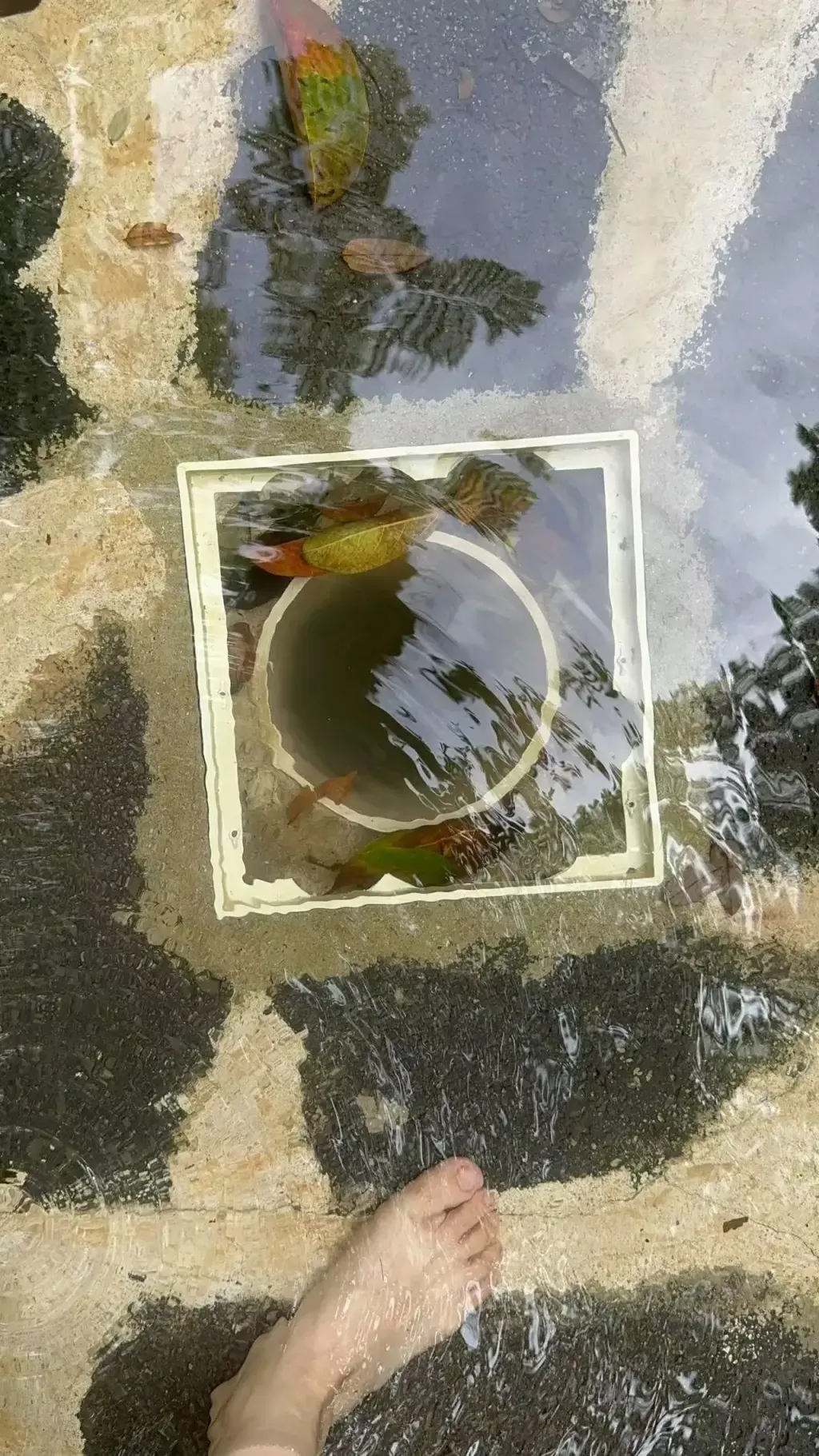 導致事故發生的關鍵區域——兒童滑梯北側水池地面的排水管道外見一個固定在水池底的塑料防護格柵網的正方形塑料框,框體內側邊沿存在新鮮缺損,且排水管四周的水池內散落着多塊斷面新鮮的塑料格柵網碎塊。