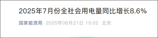 微信公眾號“國家能源局”8月21日發佈7月份全社會用電量等數據。