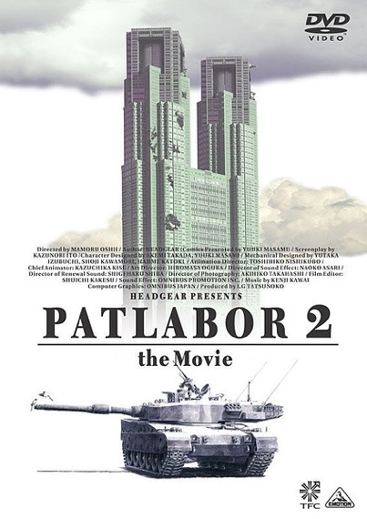機動警察 The Movie II》DVD版封面。陸上自衞隊90式坦克與東京都政府大樓被置於一處,暗示了本片的主題與政治隱喻。