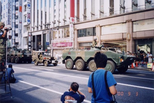 “東京大拯救2000”演習中,駛入東京銀座的自衞隊裝甲車。 資料來源:「有事法制:討論と報告 有事法制の危険性とデタラメ」(第7號 2002/05/26),http://www.jca.apc.org/stopUSwar/Japanmilitarism/yuji\_review7.htm。