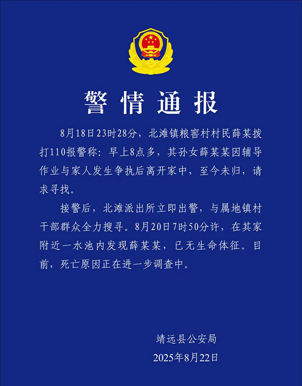 甘肅省白銀市靖遠縣公安局微信公眾號“靖遠公安”8月22日發佈情況通報稱,8月18日23時28分,北灘鎮糧窖村村民薛某撥打110報警稱:早上8點多,其孫女薛某某因輔導作業與家人發生爭執後離開家中,至今未歸,請求尋找。