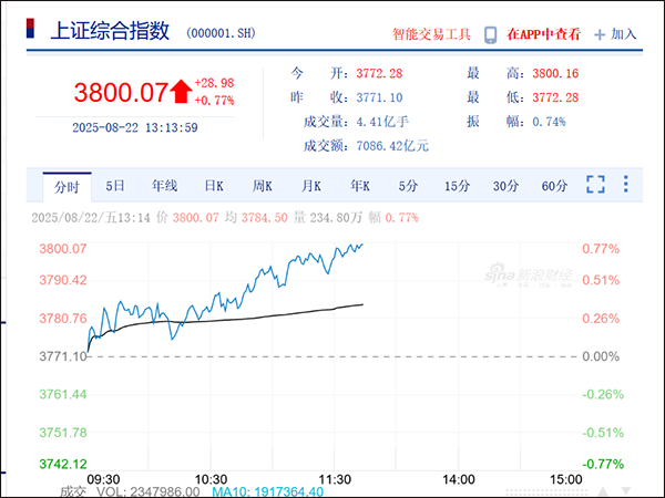 滬指站上3800點 guancha 2025-08-22 8月22日下午,滬指站上3800點, 刷新2015年8月20日以來新高,現漲0.77%。AI芯片、小金屬、教育、算力、稀土永磁、PCB等概念漲幅居前。 新浪財經