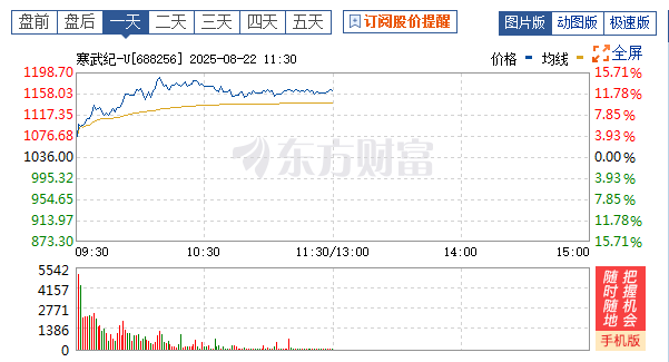 具體來看,寒武紀盤中一度漲超15%,股價最高上探至1198.7元/股,隨後漲幅有所回落。目前,寒武紀漲12.40%,報1164.45元/股。海光信息盤中19.98%,衝擊20cm漲停。午間收盤時漲超17%,現報181.7元/股。