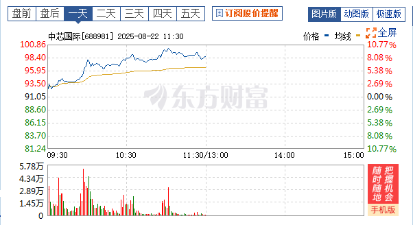 此外,中芯國際早間也持續走強,一度漲10.77%,現報98.59元/股,漲8.28%。