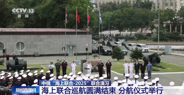 8月20日,參加完中俄“海上聯合-2025”聯合演習的中俄海軍艦艇進行海上聯合巡航。巡航結束後,中俄艦艇編隊在西太平洋某海域舉行分航儀式。