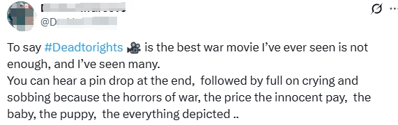 一位美國觀眾稱讚《南京照相館》是其看過的最好的戰爭片,“這種評價甚至還不夠,影片結束時,現場寂靜得彷彿能聽見針落地的聲音,隨後是此起彼伏的哭泣與抽泣聲。因為戰爭的恐怖、無辜者付出的代價、那個嬰兒、那隻小狗,以及每一個被刻畫的細節都直擊人心。”