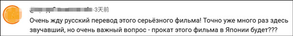 此外,有觀眾表達了對多語種版本的期待:“我非常期待這部嚴肅電影的俄語翻譯!還有一個被反覆問到卻至關重要的問題——這部電影會在日本上映嗎?”