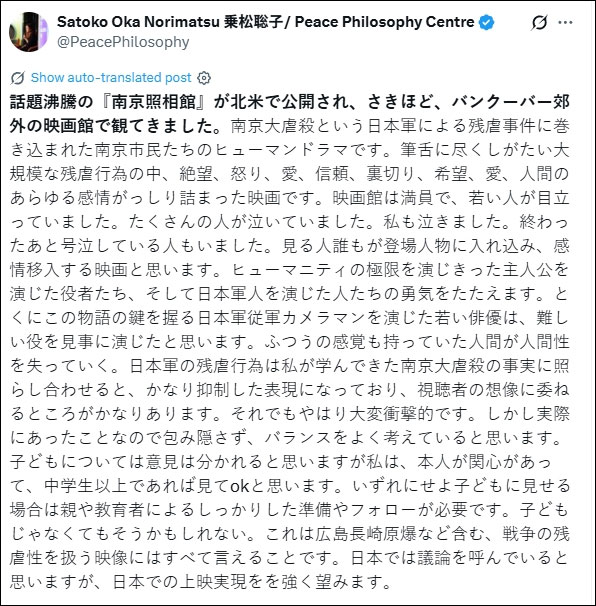 “許多人在哭,我也哭了。”乘松聰子寫道,“這部電影講述了南京市民被捲入南京大屠殺這一日軍暴行中的人性故事。在難以言表的大規模暴行中,人類的每一種情感——絕望、憤怒、愛、信任、背叛、希望和愛都融入其中。”