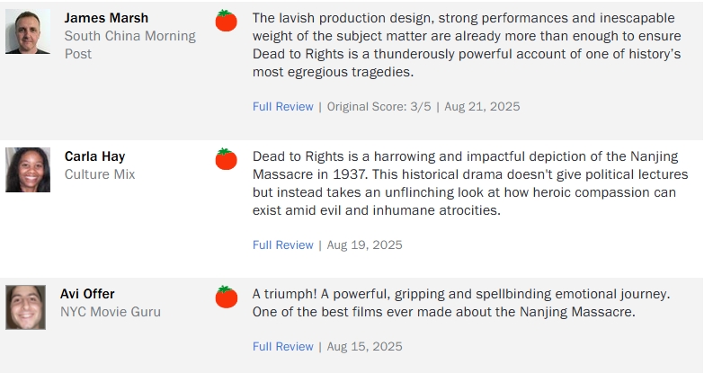 《紐約電影大師》(NYC Movie Guru)的阿維·奧費(Avi Offer)力贊該電影在同類作品中的卓越性:“堪稱傑作!一段強有力、扣人心絃且引人入勝的情感之旅。這是有史以來關於南京大屠殺最好的電影之一。”