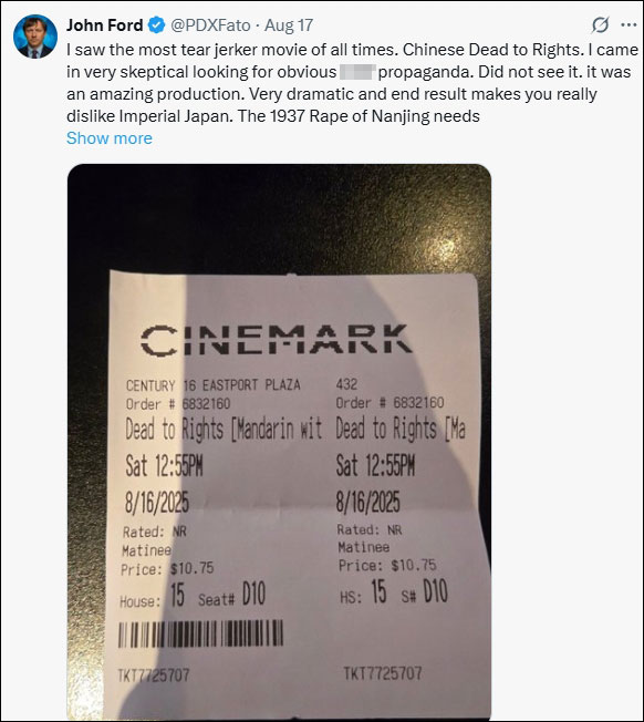 美國觀眾約翰·福特在推特發文稱:“我看了有史以來最催人淚下的電影——中國電影《南京照相館》。起初我帶着懷疑的態度,以為會看到明顯的中國政治宣傳,但沒有看到。這是一部令人驚歎的作品,極具戲劇張力,讓人對日本帝國主義產生強烈的反感。1937年的南京大屠殺應當被銘記。”