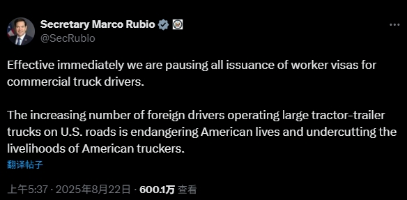 “即日起,我們將暫停向所有商業卡車司機發放工作簽證,”魯比奧21日在社交媒體X平台宣佈,“越來越多的外國司機在美國道路上駕駛卡車,不僅危及美國人的生命,還損害了美國卡車司機的生計。”