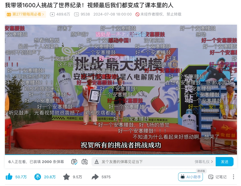 去年,元氣森林攜手自媒體創作者南翔來到延安,籌備四個月,發起了一場千人安塞腰鼓表演挑戰,1600人在黃土高原腰鼓齊鳴。視頻上線後彈幕瞬間淹沒屏幕,網友們紛紛留言:“好一個安塞腰鼓”“非遺的力量太燃了”“DNA在沸騰”……
