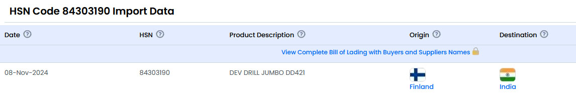 在其他商務平台上搜到的零星記錄,也能佐證這一點,比如2024年,84303190項下有型號為DD421的Sandvik公司的鑽孔設備,鑽孔放炸藥,倒挺合適隧道挖掘。