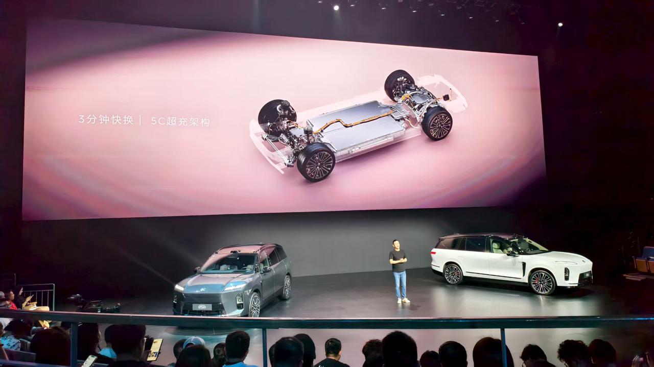 在這一次的第三代ES8上,蔚來全系標配102kWh電池包,能夠提供CLTC工況635km的續航里程。與此同時,新車也升級為全域900V高壓架構,在換電優勢之外也能夠實現峯值420kW的充電功率。
