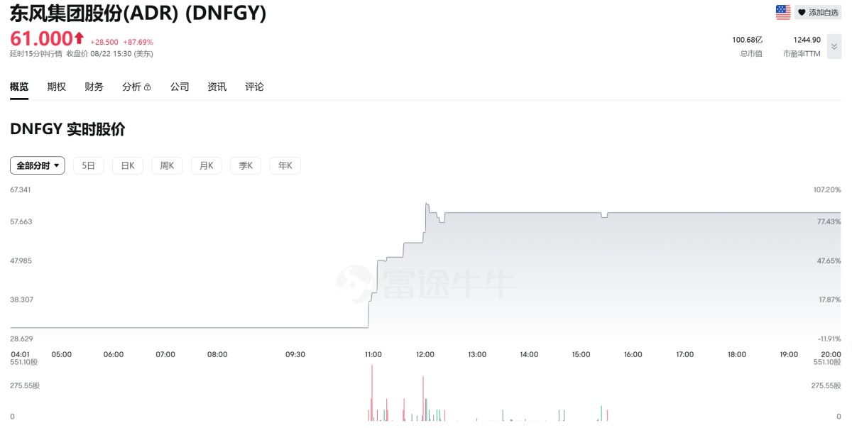 該消息發佈之際,距離東風集團股份8月11日發佈公告停牌已經過去11天。受此消息影響,截至8月23日收盤,東風集團股份ADR報價61美元,漲幅高達87.69%。