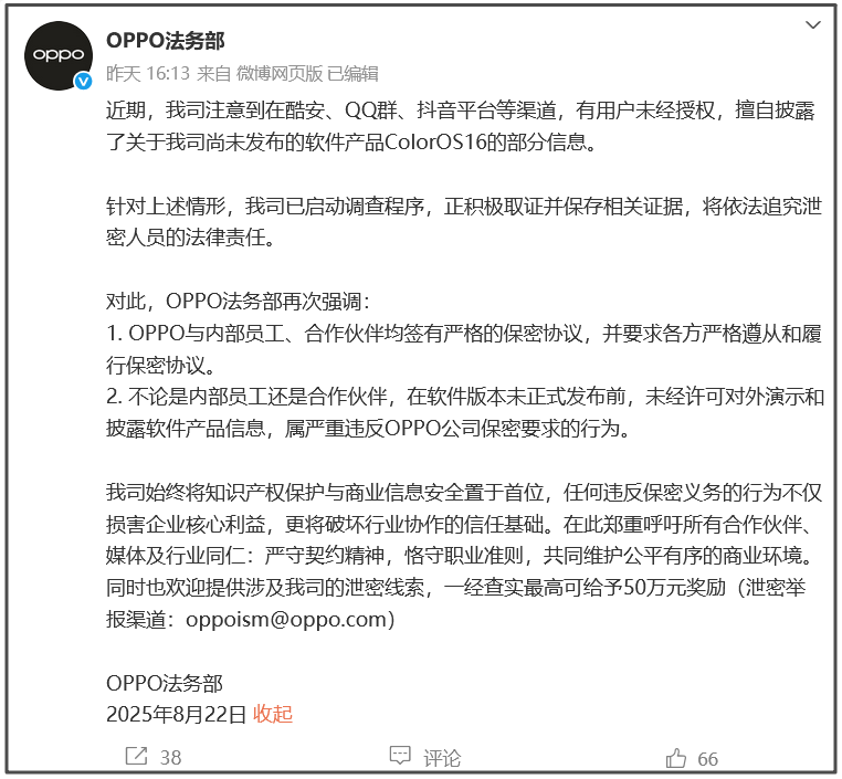 8月22日,@OPPO法務部 發佈公告: