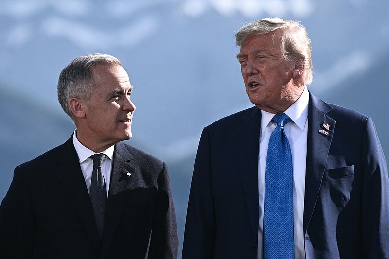 當地時間2025年6月16日,加拿大艾伯塔省卡納納斯基斯,七國集團(G7)峯會現場,加拿大總理卡尼和美國總統特朗普合影。 視覺中國