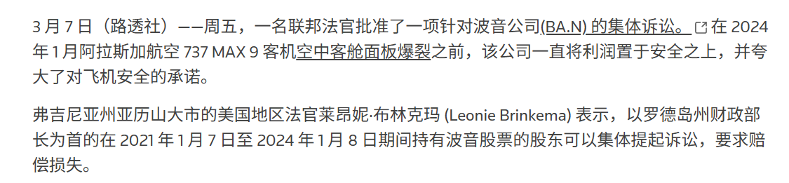 波音曾因為Max 9的事故而遭遇集體申訴 路透社