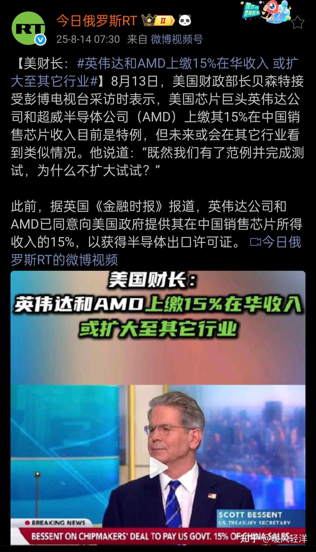而且近期我還注意到特朗普總統做了一件非常獨特的事。他推出了一則新規,要求英偉達與AMD等公司需要向美國政府上繳其芯片在華銷售收入的15%以換取出口許可。也就是説,美國政府實際上通過英偉達這類企業在徵收一種“特許税”:我允許你銷售,但你得交15%的“税”,以此來干預英偉達等公司在海外銷售芯片的行為。