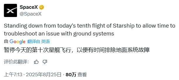 當地時間8月24日,在原定的發射時間30分鐘前,美國太空探索公司(SpaceX)在社交媒體X上公開宣佈暫停其“星艦”(Starship)的第十次試飛任務,並表示問題來自地面系統的故障。