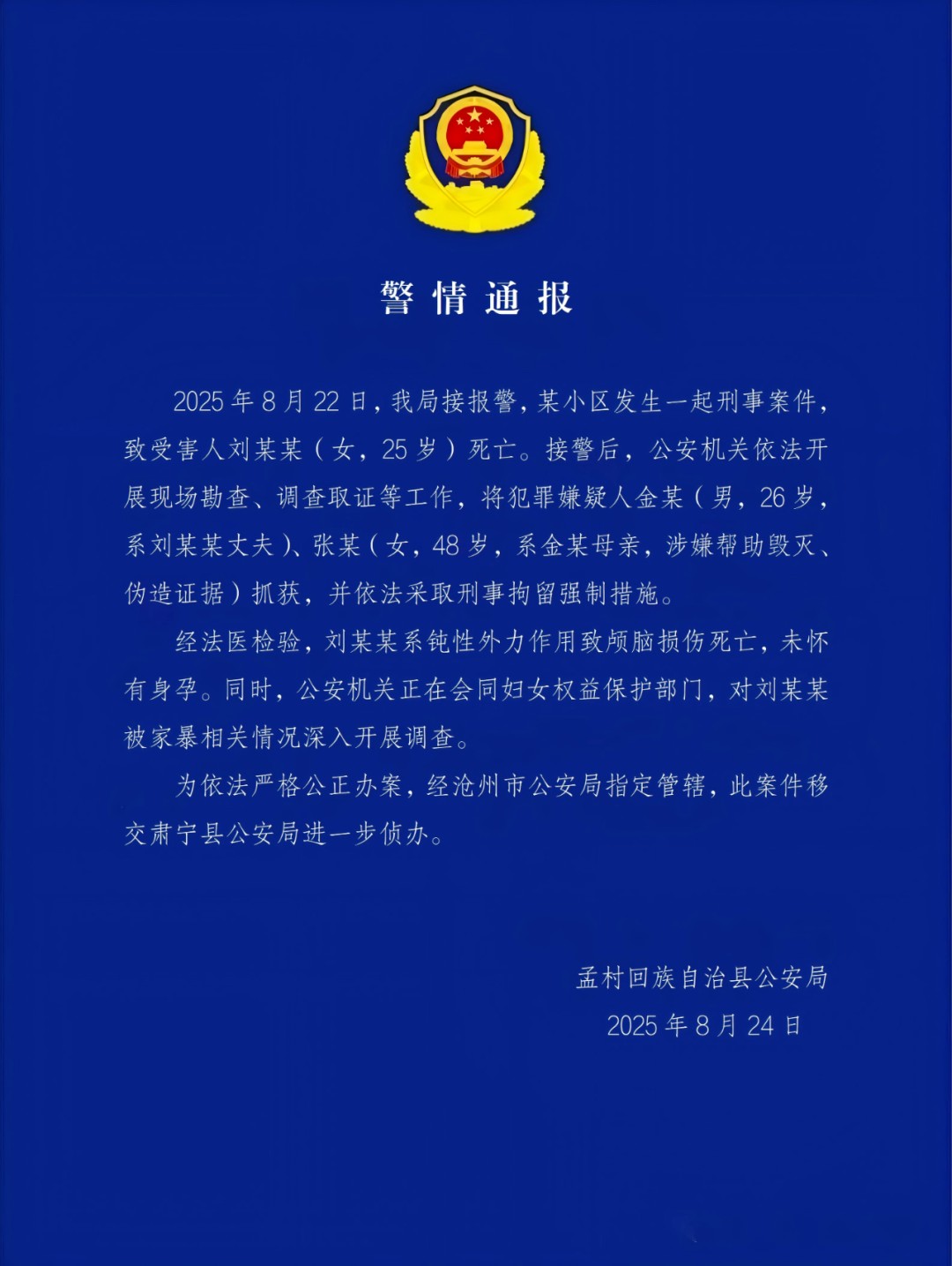 2025年8月22日,我局接報警,某小區發生一起刑事案件,致受害人劉某某(女,25 歲)死亡。接警後,公安機關依法開展現場勘查、調查取證等工作,將犯罪嫌疑人金某(男,26歲系劉某某丈夫)、張某(女,48歲,系金某母親,涉嫌幫助毀滅偽造證據)抓獲,並依法採取刑事拘留強制措施。