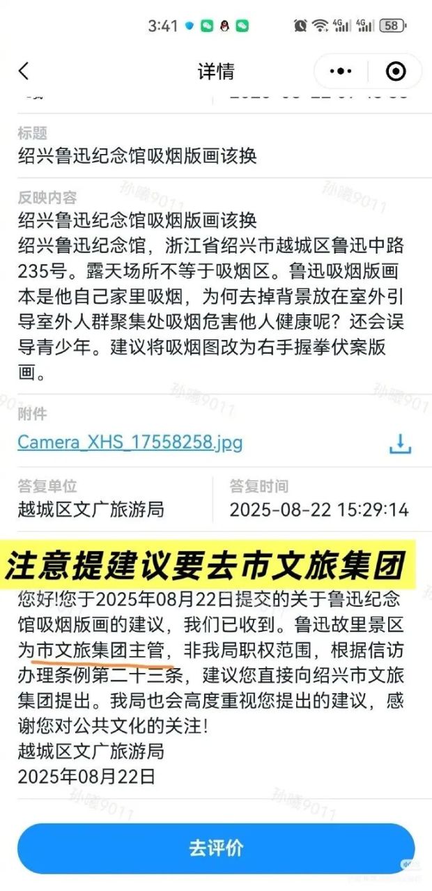 越城區文廣旅遊局的回覆稱:“魯迅故里景區為市文旅集團主管,非我局職權範圍,建議您直接向紹興市文旅集團提出。”
