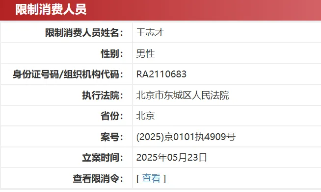 而據中國執行信息公開網,王志才名下有多條限制消費令,最近一條立案時間為今年5月23日。