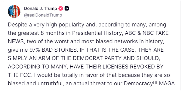 特朗普形容這兩家媒體是“民主黨的附庸”,並表示:“很多人認為FCC應該吊銷它們的執照,我完全支持,因為它們太有偏見,太不誠實,對我們民主構成了真正的威脅。”