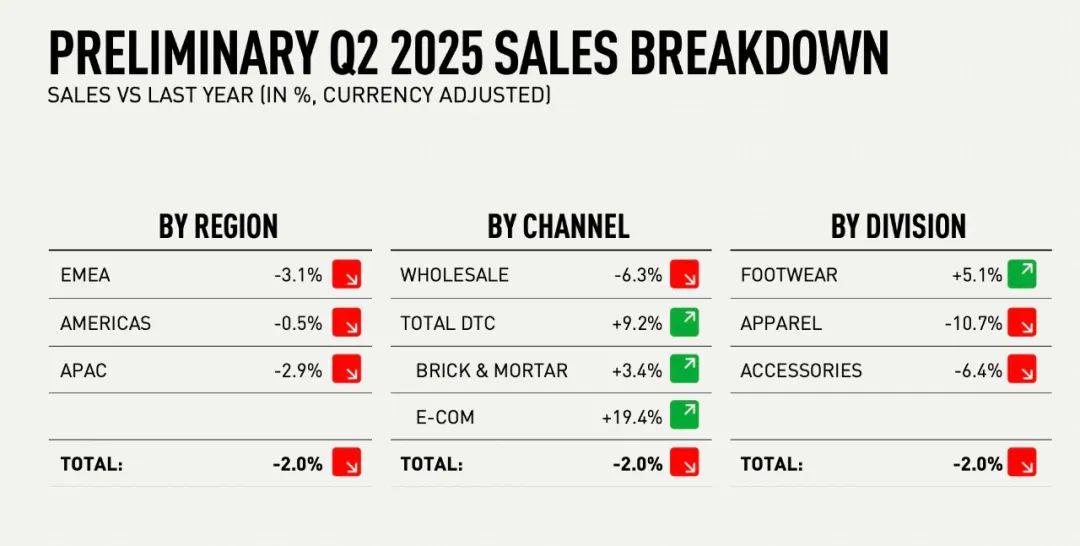 7月,Puma發佈了2025年第二季度財報。數據顯示,Puma第二季度銷售額下降2.0%至19.42億歐元,近兩年首次出現季度銷售額下滑。此外,無論是按地區、按渠道還是按品類,Puma關鍵財務數據都被標註了下滑的紅色。