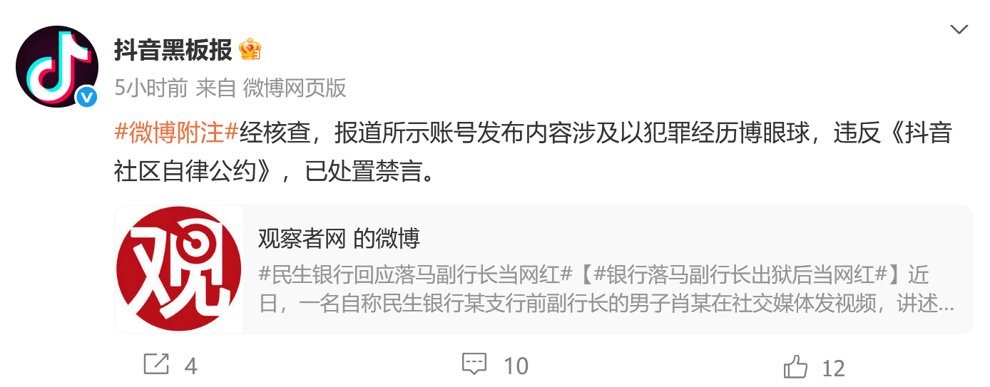 8月26日,@抖音黑板報 轉發觀察者網上述微博並表示:經核查,報道所示賬號發佈內容涉及以犯罪經歷博眼球,違反《抖音社區自律公約》,已處置禁言。