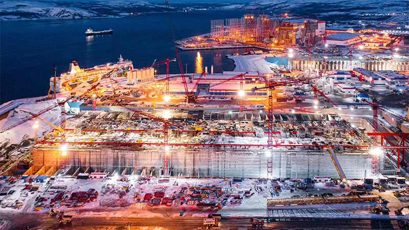 俄羅斯的北極液化天然氣二號項目位於北極圈內的吉丹半島,初始投資為210億美元,由俄能源巨頭諾瓦泰克公司控股(60%),中石油、中海油、法國道達爾能源和日本北極液化天然氣財團四方各持有10%的股份。項目共有三條生產線,預計液化天然氣年產能將達到1980萬噸,穩定凝析油年產能為160萬噸。